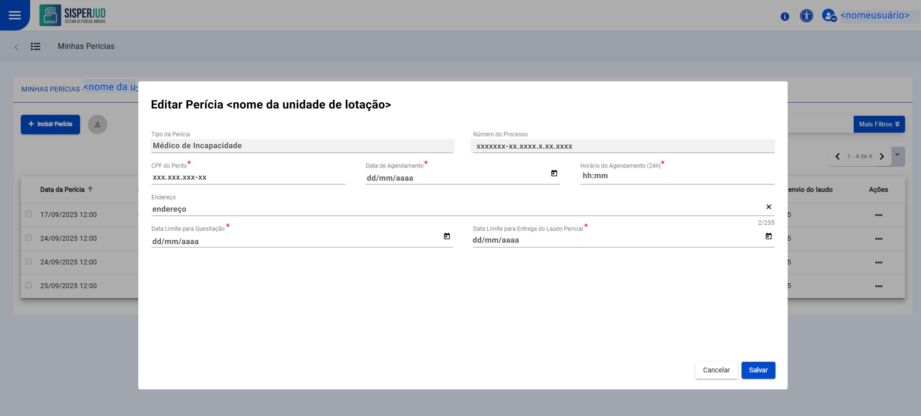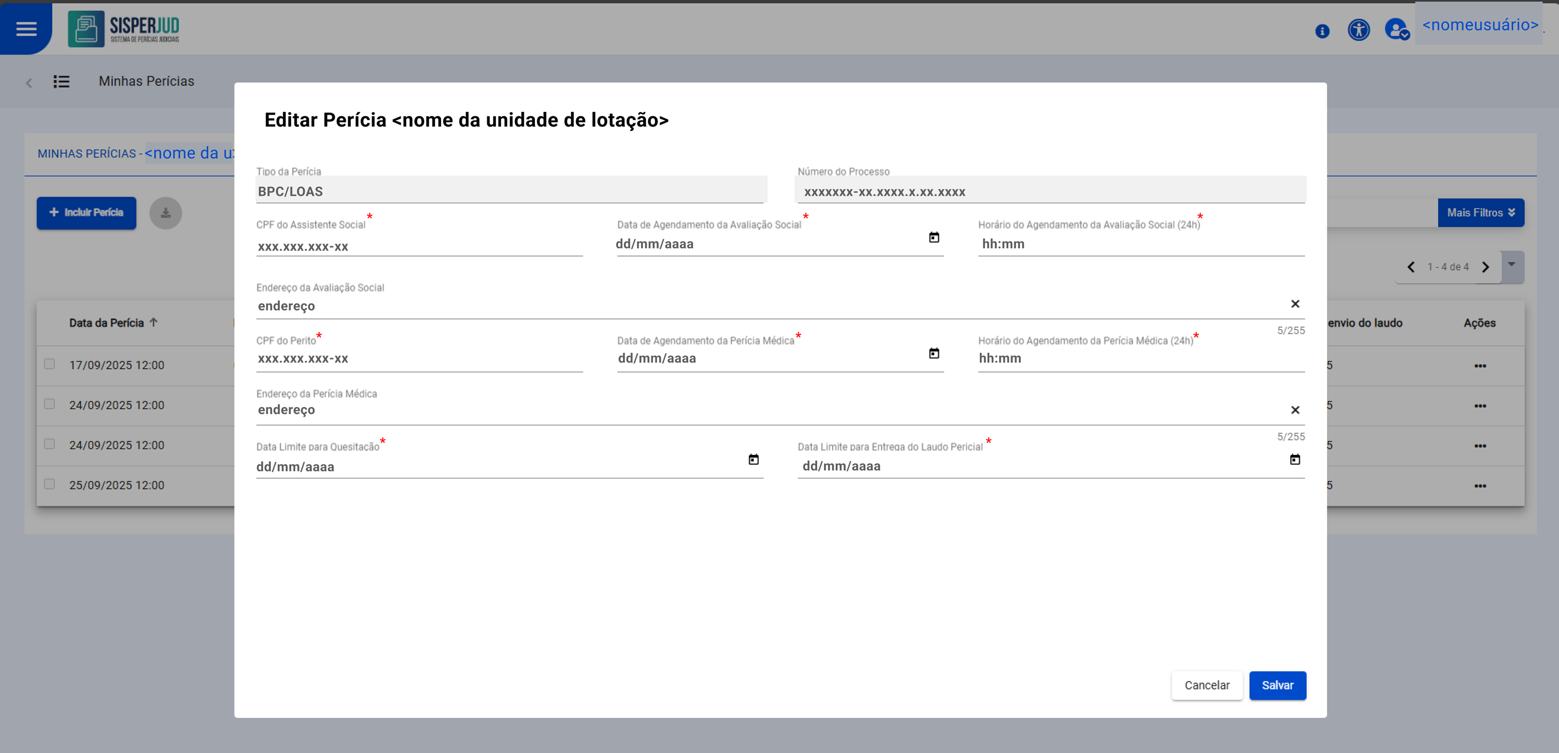 Os demais campos, como CPF perito, CPF assitente social, datas de agendamento, horários, endereços, podem ser alterados livremente para corrigir ou atualizar o cadastrao da perícia.