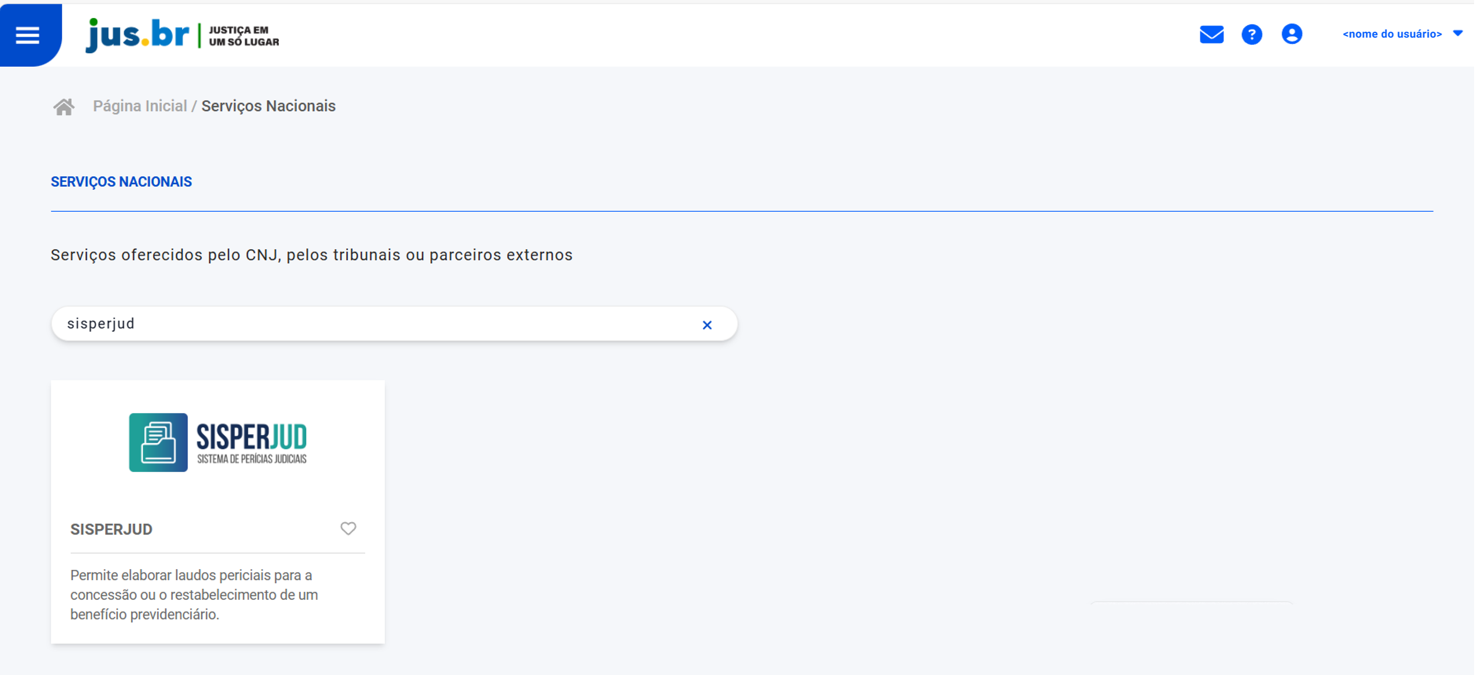 Após o login, o usuário é redirecinado para o Portal de Serviços Nacionais. Serviços oferecidos pelo CNJ, pelos tribunais ou parceiros externos.