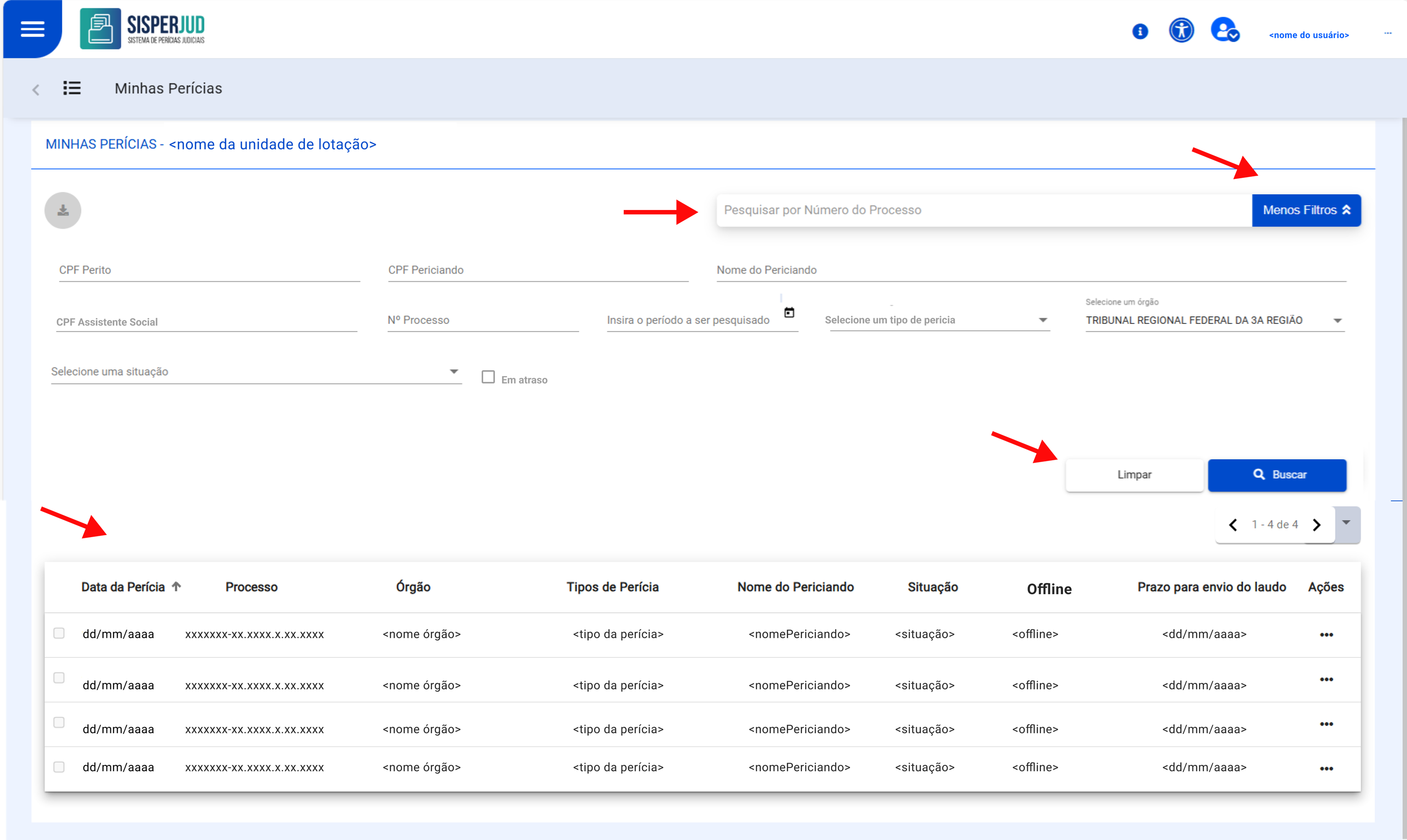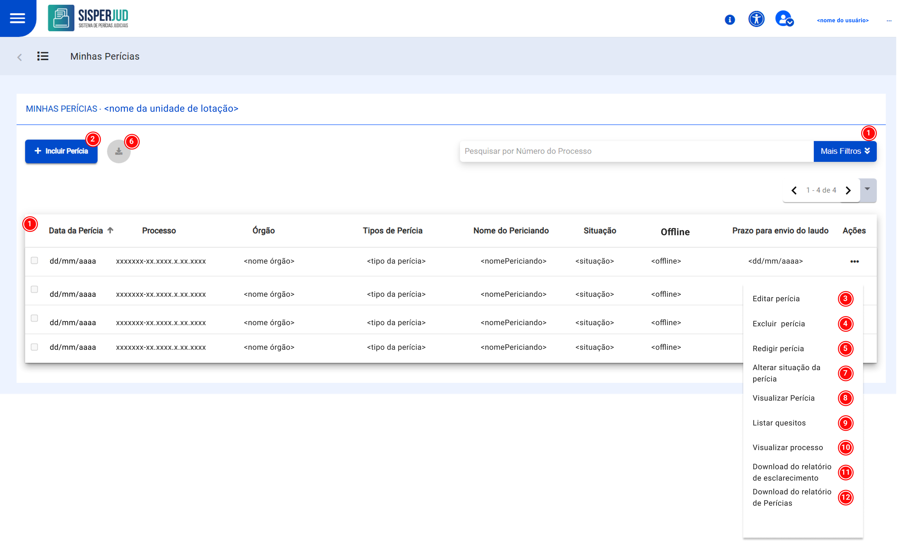 Para usuários externos: A lista inicial estará vazia. Para visualizar as perícias, o usuário precisa realizar uma consulta específica, buscando as que estão vinculadas ao seu CPF.